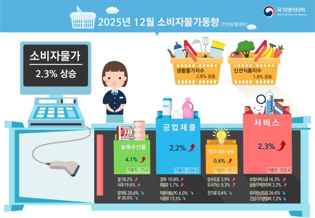 통계청이 발표한 2025년 12월 소비자물가동향에 따르면 소비자물가지수는 전월 대비 0.3%, 전년 동월 대비 2.3% 각각 상승했으며, 연간 기준으로는 소비자물가 2.1%, 근원물가 1.9% 상승을 기록했다.